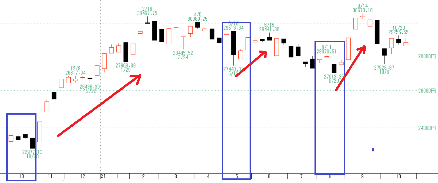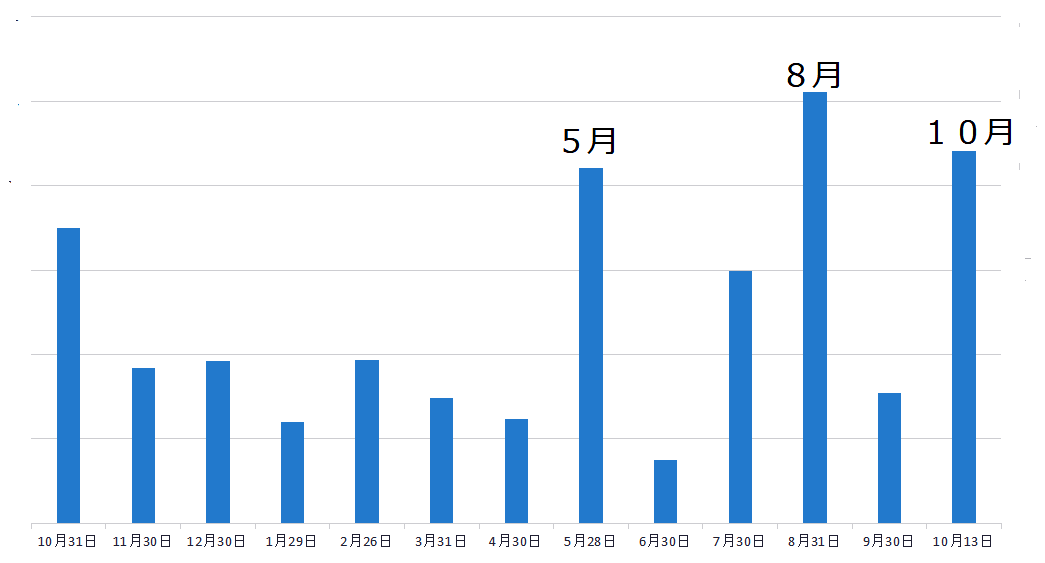 上は日経平均月足です。10,5,8月を青で示しています。その後大幅高しています。10月は8月に次ぐ高水準の追証件数でしたので、11月以降は年末相場に向けて期待が持てそうです。