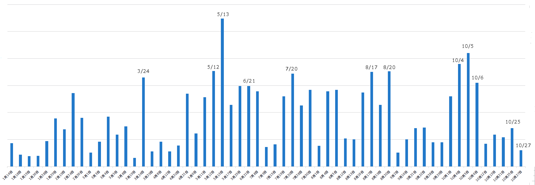 上は今年の主な追証発生日と推定件数グラフです。独自に調査したものです。次に月別でみてみます。