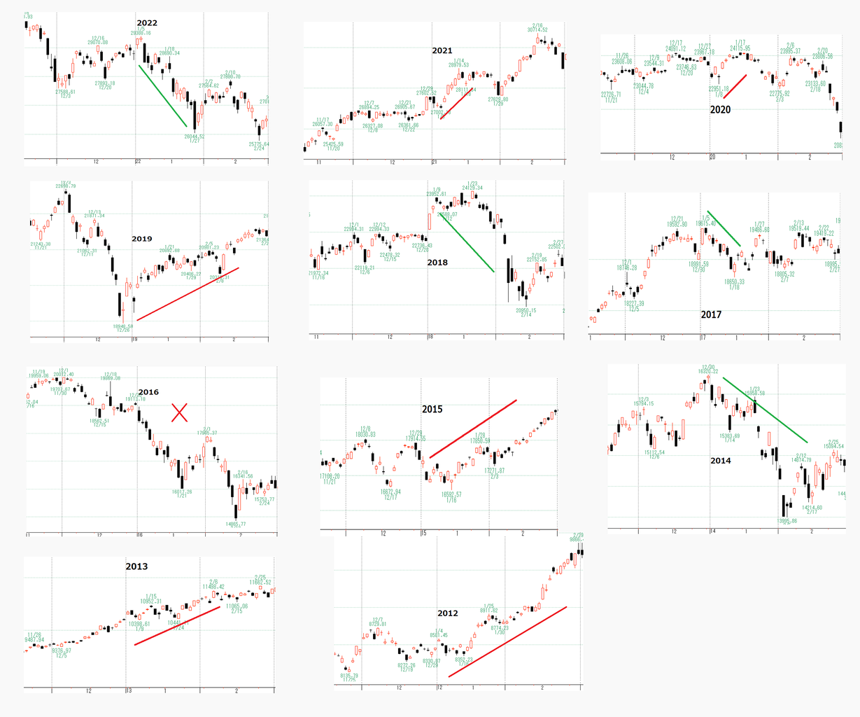 上は2012年~2022年の大発会前後の日経平均です。過去11回で、その後1~3か月の動きは2016年を除き、大発会からの3日間に左右されています。