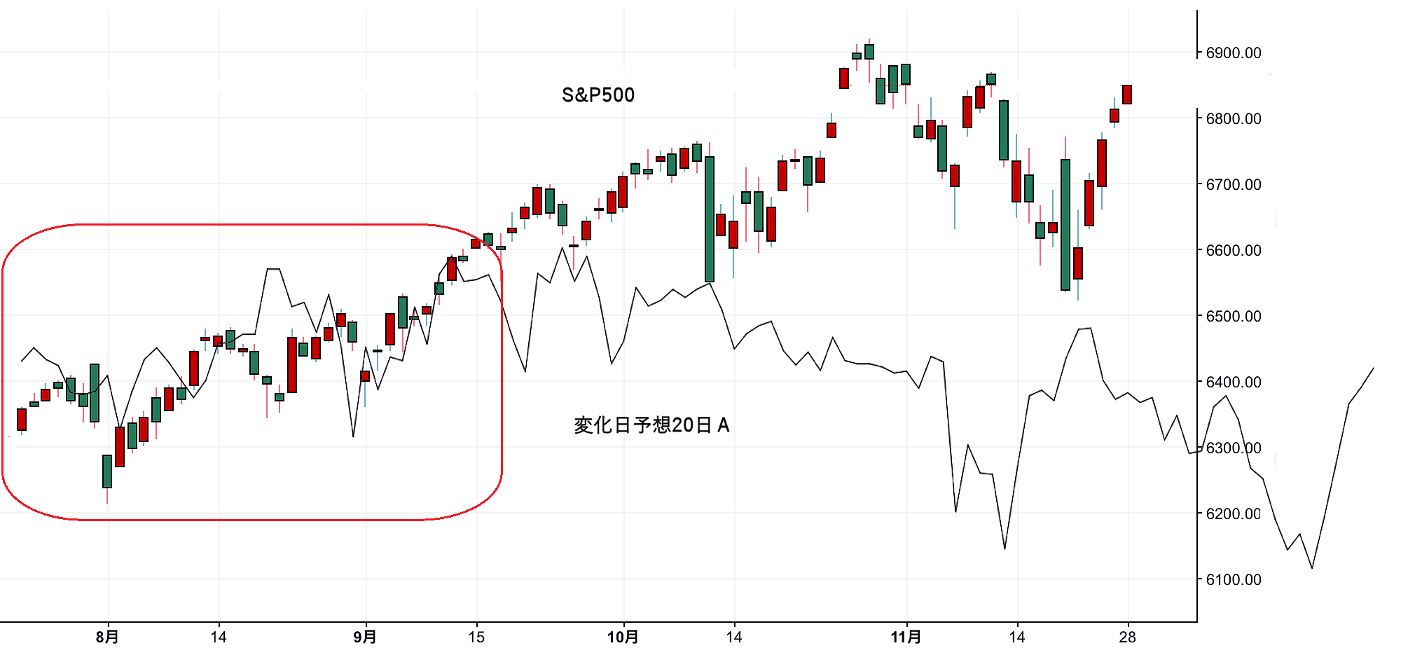 変化日のみの予想です。変化日が高値=売り、変化日が安値=買いになります。赤の期間は同じような動きですが、変化日予想を上下反転するとこうなります。