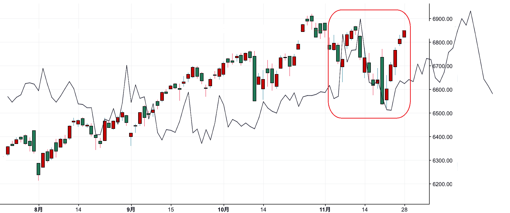 今度は赤の期間が同じような動きになります。株価は大きく戻しており、目先は調整があると思いますが、スピード調整で終わると思います。