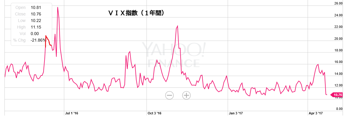 VIX指数が急低下しています。昨日は2014年6月30日以来の低い数字でした。