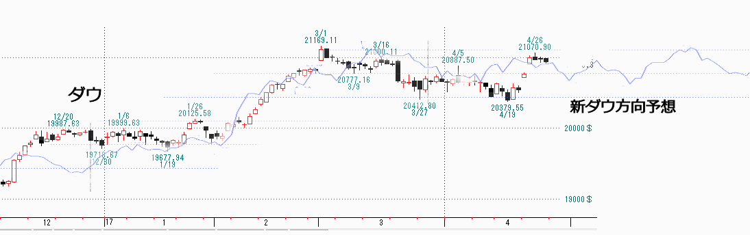 約半月後に天井を迎えました。 しかしVIXがさらに低下あるいは横ばいの場合はダウが上昇するかもしれません。VIXが急上昇に転じたときは売りです。GW中は世界で政治・経済イベントが突きますので、VIXも上下に動く可能性があります。