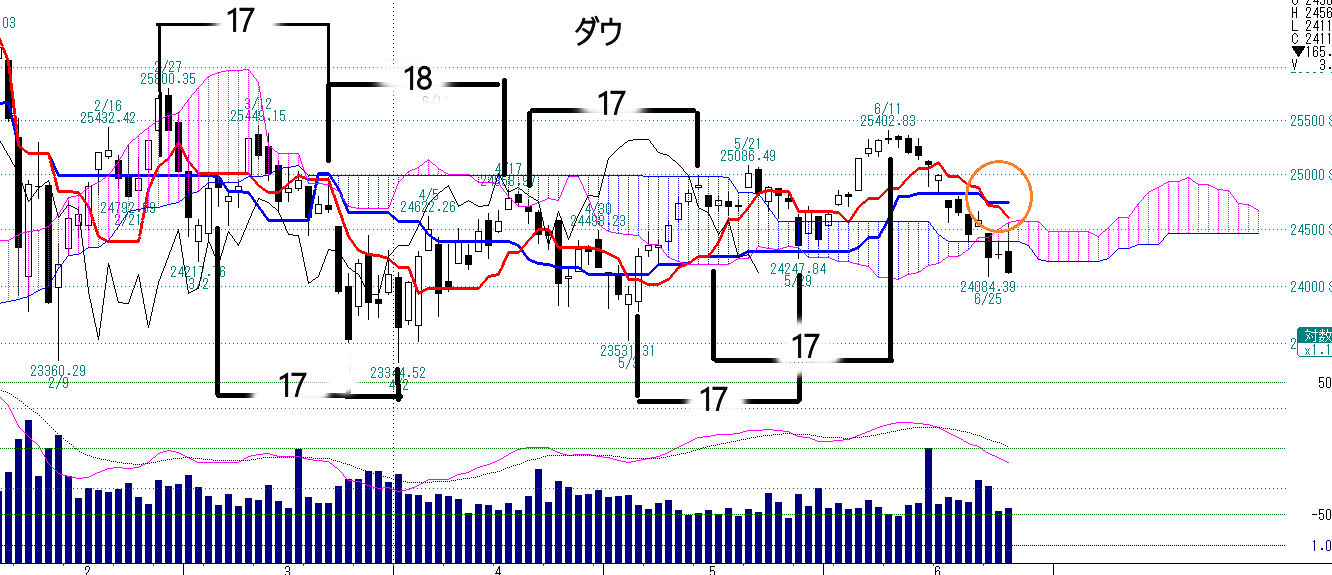 右のオレンジの丸は転換線が基準線を下回るデッドクロスとなっています。デッドクロスなので通常は売りです。この転換線と基準線のデッドクロス、ゴールデンクロスから17~18日目にダウは買いまたは売りとなっています。次の17,8日目は7月21日頃になります。そこが買いなのか売りなのかは分かりません。しかし、ダウはリバウンドしたとしてももう高値を奪回する力はないと思います。