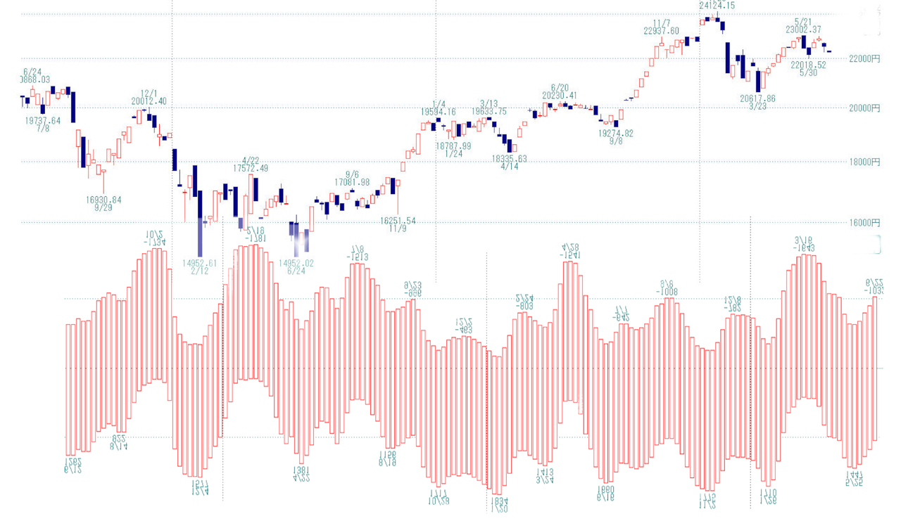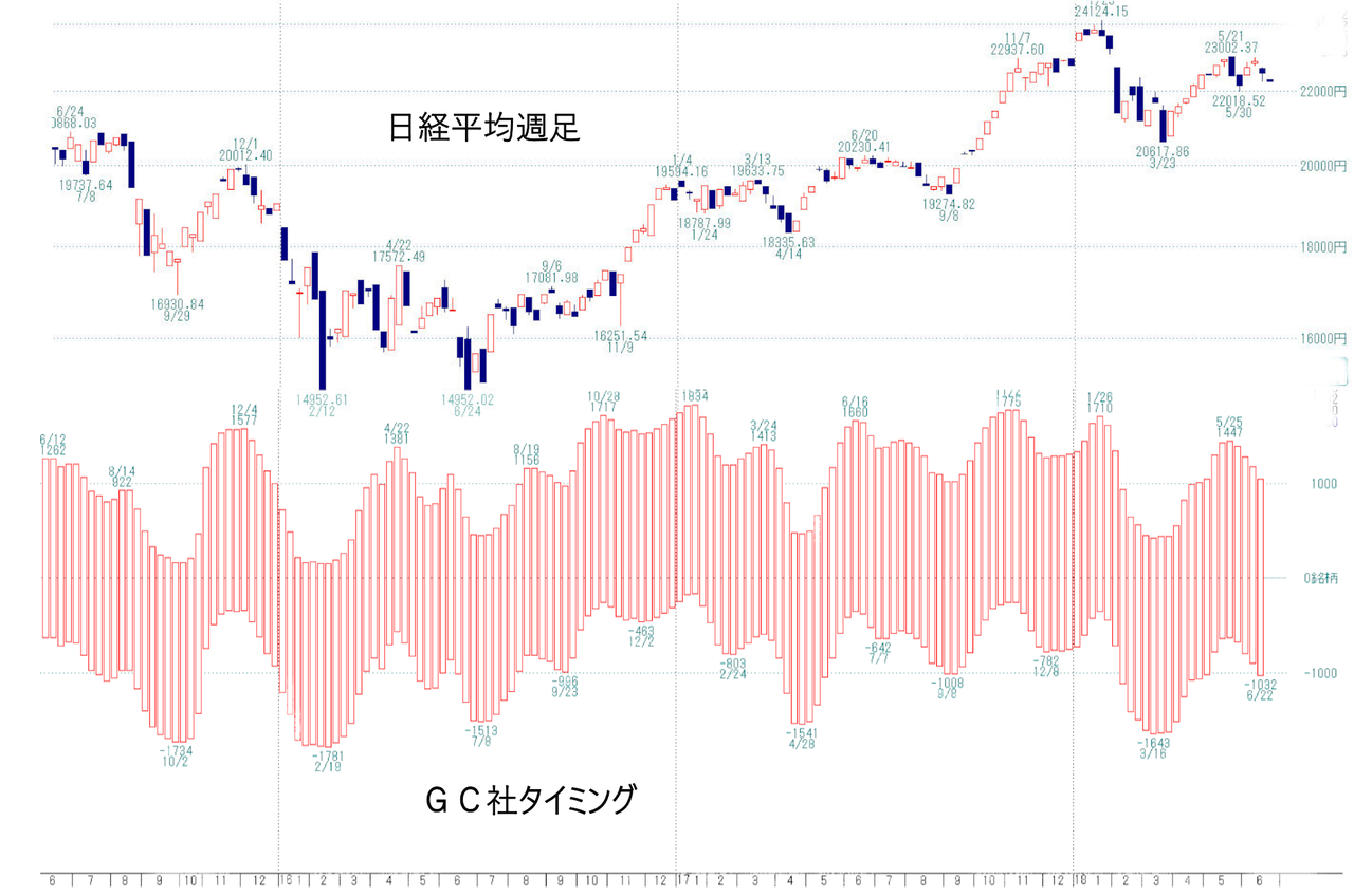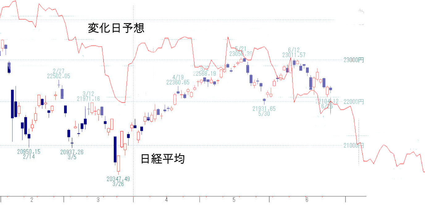 上は当社独自の変化日予想で、約150日以上前から予想したものです。数日の誤差はありますが、概ね当てています。なお、日経平均と同じような動きをしていますが、あくまでも変化日予想であって日経平均を予想したものではございません。次の変化日は7月4日頃になります。そこが買いになればいいのですが。