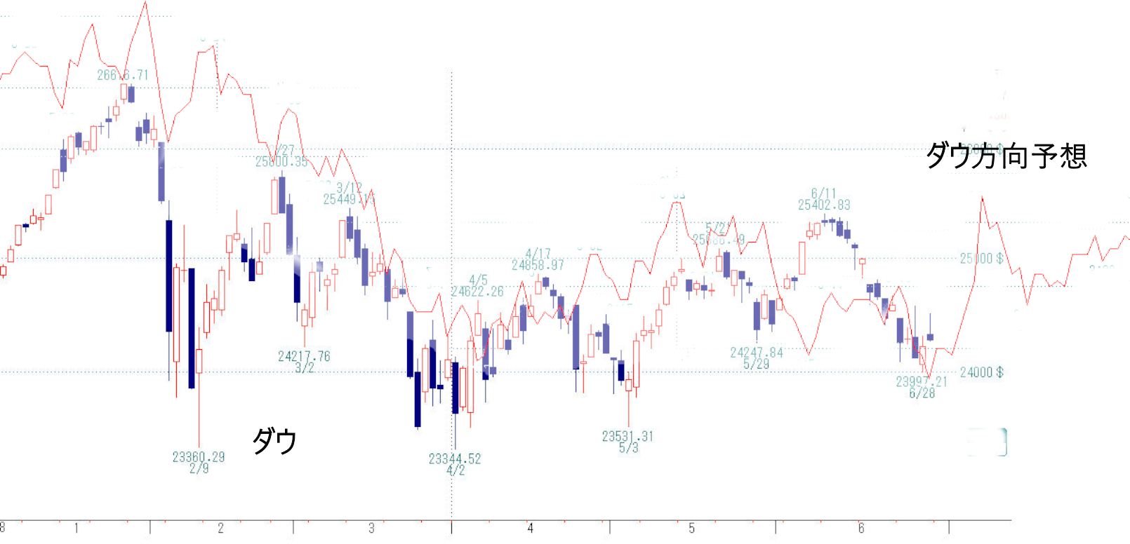 当社独自の「ダウ方向予想」です。6月前半は間違えましたが、中期でみればほぼ予想通りです。底入れはあと数日を示していますが、変化日予想では今日、明日が買い転換を示しています。そろそろ強気で良いかと思います。