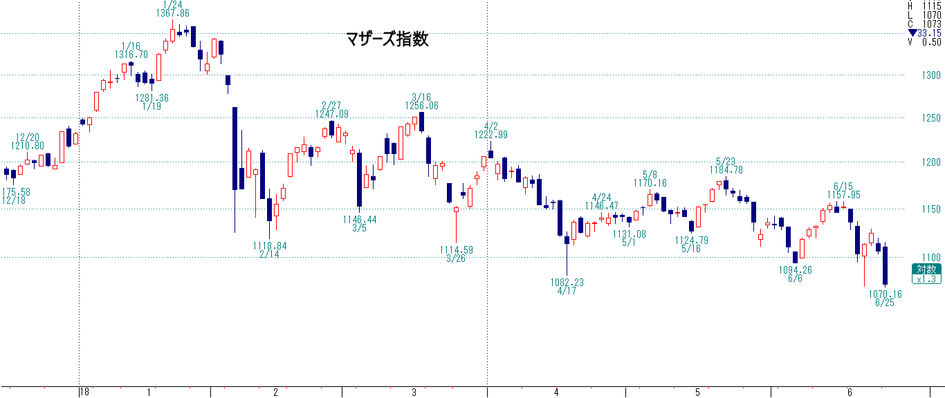 マザーズ指数は安値を更新しました。アベノミクス以降、小型株で儲けた成功体験を忘れる努力も必要かもしれません。