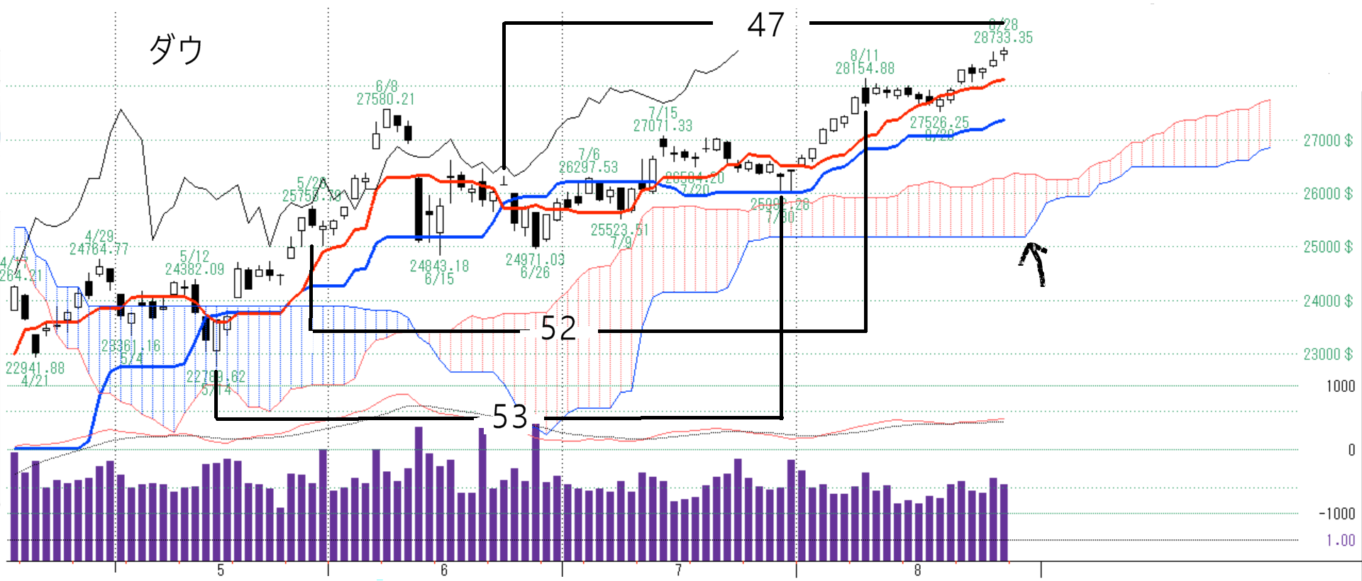 6月23日クロスから先週で47日目。また下の矢印は先行スパン②が変動する日を示しましたが、水曜日になります。