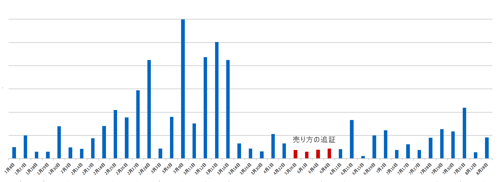 これまで8月末から9月初めは調整と予想していましたが、少し後ずれする可能性はあります。しかし、いずれにせよ短期調整で終わると思います。