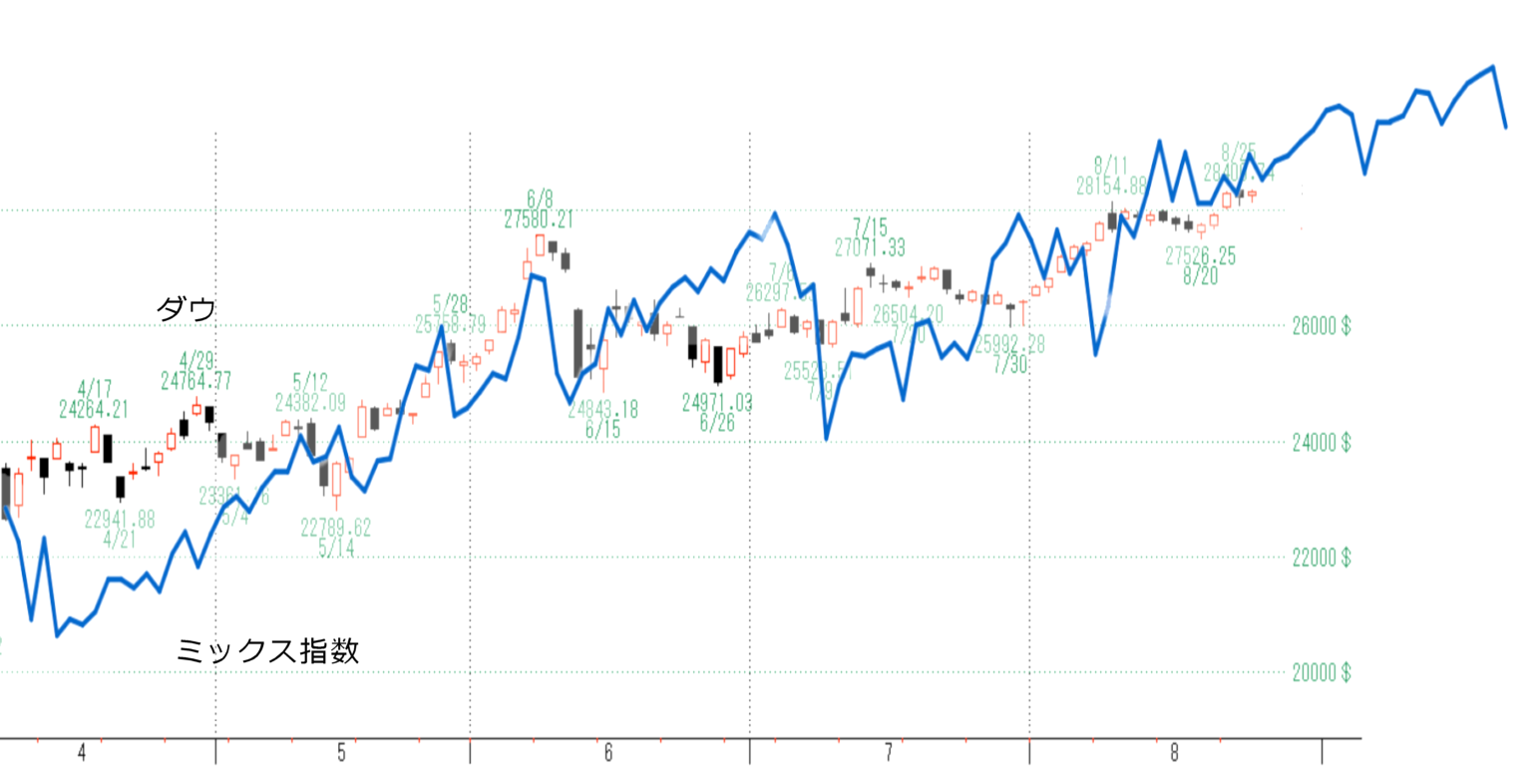 このように長期的には株式市場は期待できますが、目先は警戒と思います。ダウ採用銘柄の大幅な入れない、アップルの1:5の株式分割があり、急騰の可能性もありますが、スピード調整と予想します。