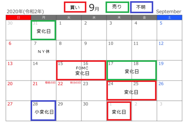 上はダウの一目均衡表です。転換線(赤)と基準線(青)のクロスの翌日から50日ちょっとに変化日が到来する傾向にあります。過去を検証しても51日~53日後に収まります。
