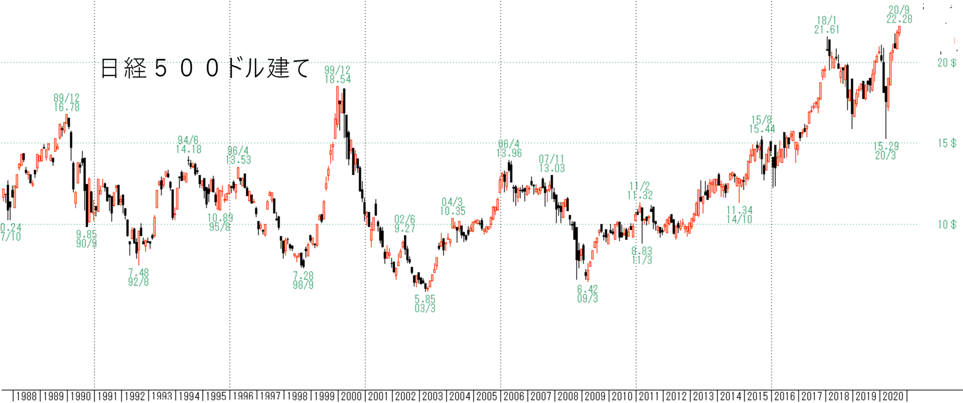 日経平均、TOPIX、日経500は戻り高値を取りました。特に日経500は1990年1月以来の高値です。さらにドル建てだとこんな感じです。