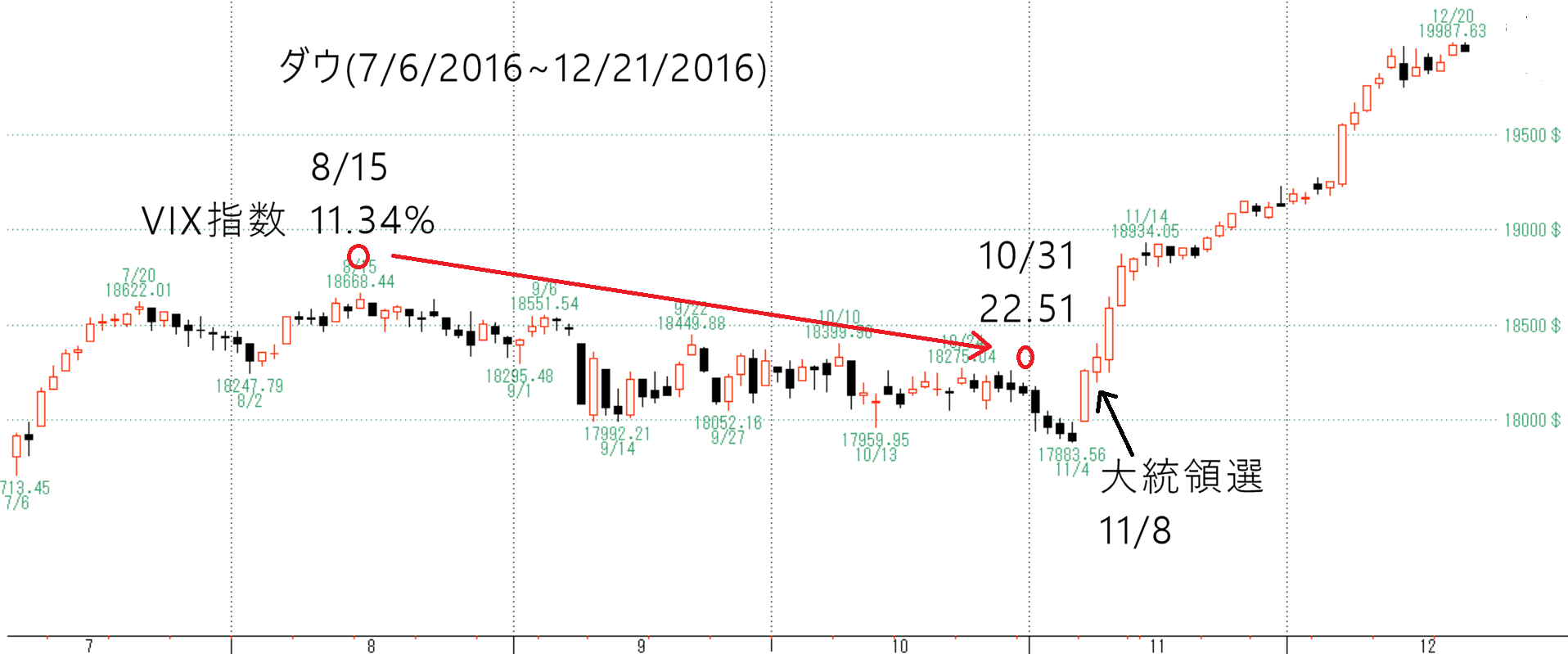 2016年8月15日VIX11.34% → 10月31日22.51% と2倍に上昇。クリントン優勢が伝えられ、ダウは調整、VIXは上昇。しかし、トランプ当選でダウは急騰、VIXは低下となりました。