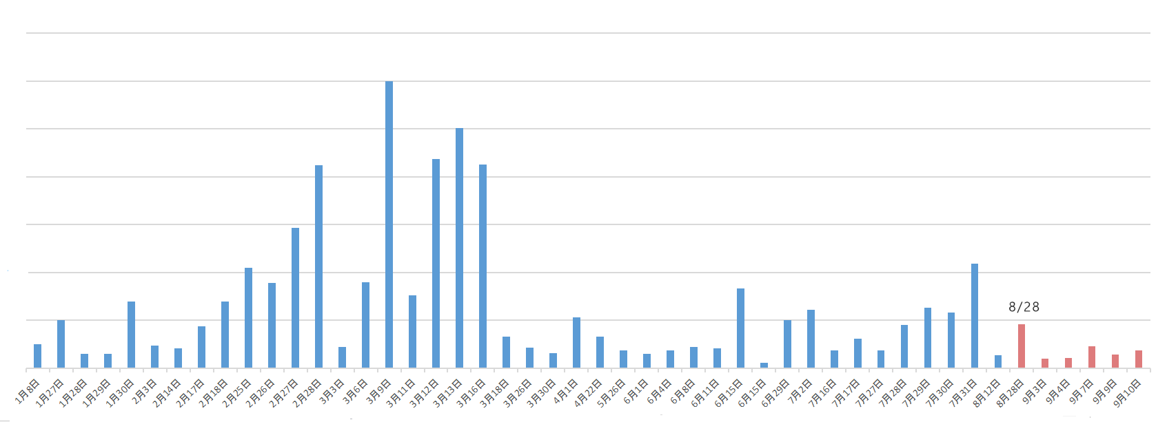 マザーズを除く主要指数プラス。マザーズ指数も0.8%安と小幅でした。しかし、予想外に追証は発生しています。以下今年の「主な追証発生日と推定件数」グラフです。