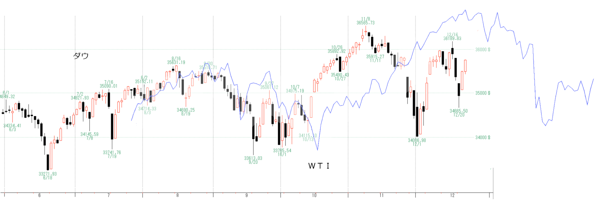 WTIを約40日右へ移動しています。すると11月前半まで同じような動きになりました。つまり、WTIはダウの40日先行指標ともいえます。しかし直近は違う動きにみえますので、直近の上下幅を合わせます。
