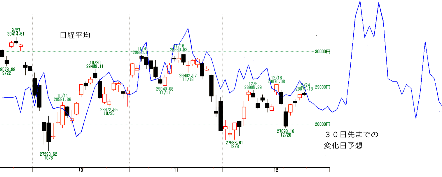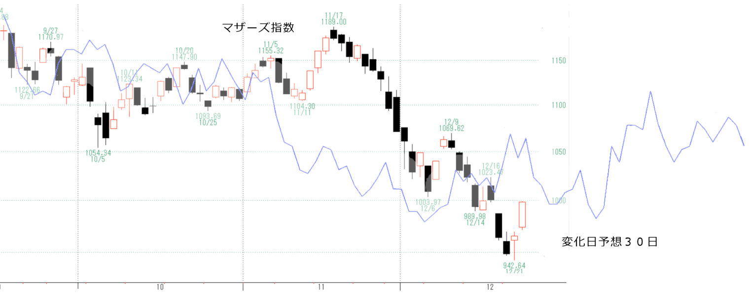 マザーズ指数の約30日先までの「変化日」予想です。なお、データ元との関係で1,2日の誤差が常に発生します。