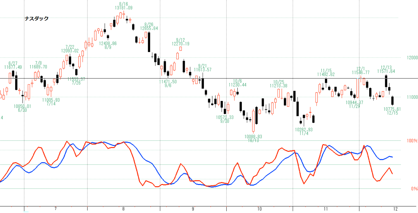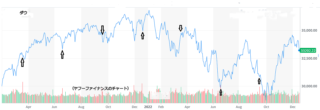 上はダウチャートにメジャーSQ日を示しています。MSQを高値で迎えれば売り、安値だと買いの傾向ですが、今は高値でも安値でもなく判断が難しいです。数日間様子みて動いた方に乗ればいいでしょう。