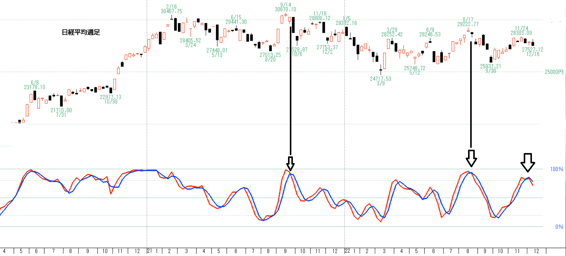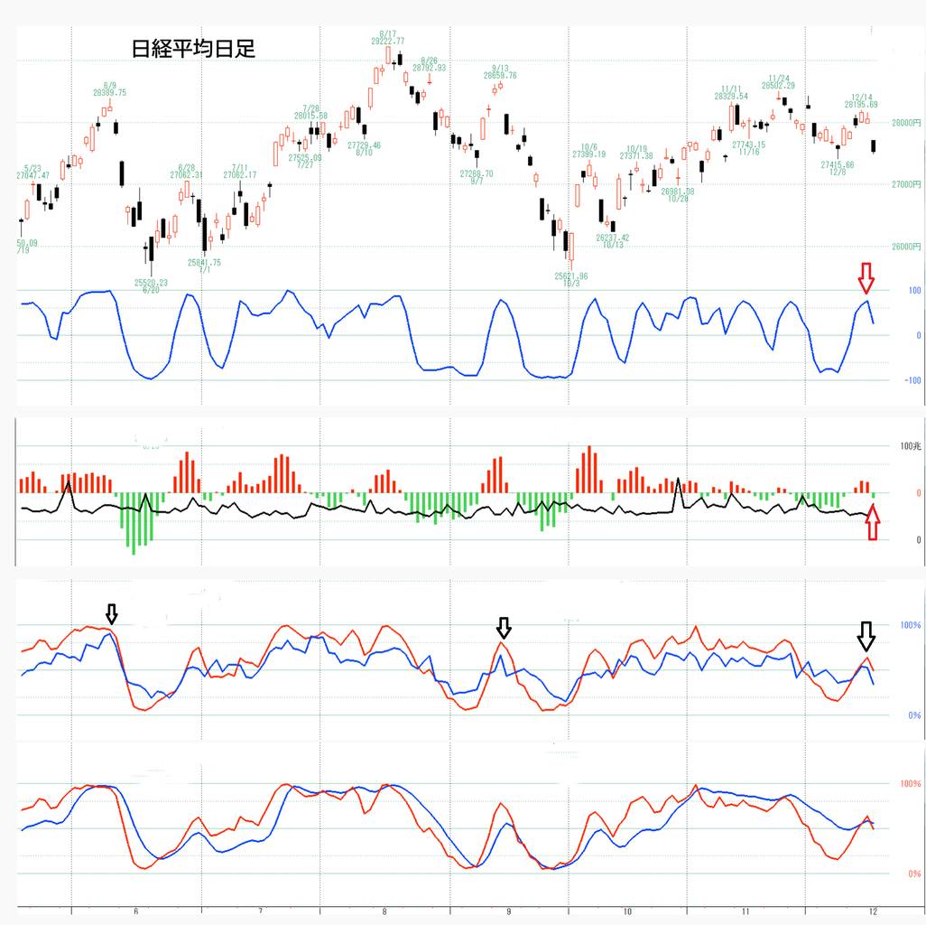 日経平均下の4つは短期の売買サインを示しています。4つとも少なくとも買いではない動きです。