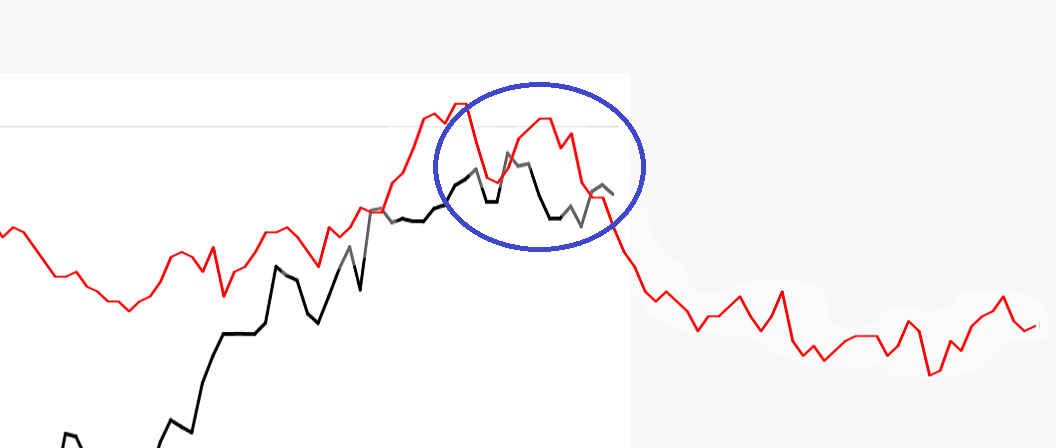 上は米10年国債利回り月足です。金利はピークをつけたと思います。問題は2年物の低下が遅いことです。2-10年債の逆イールドは経済悪化の証明です。長期金利は今後低下するでしょうから、それ以上の2年債の低下が必要です。