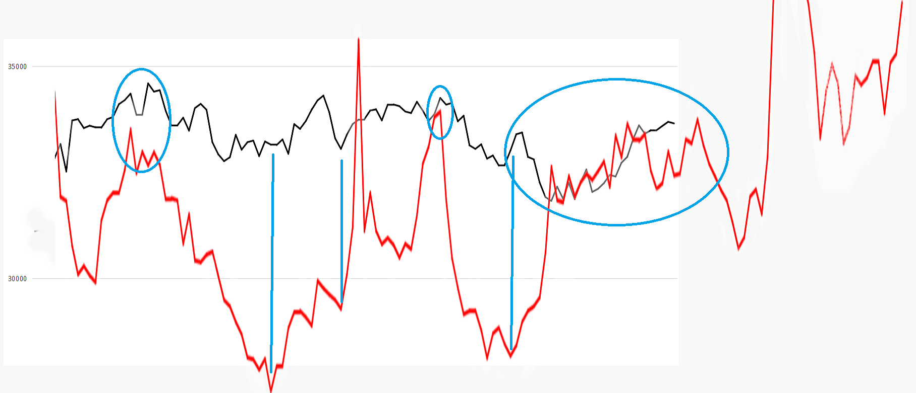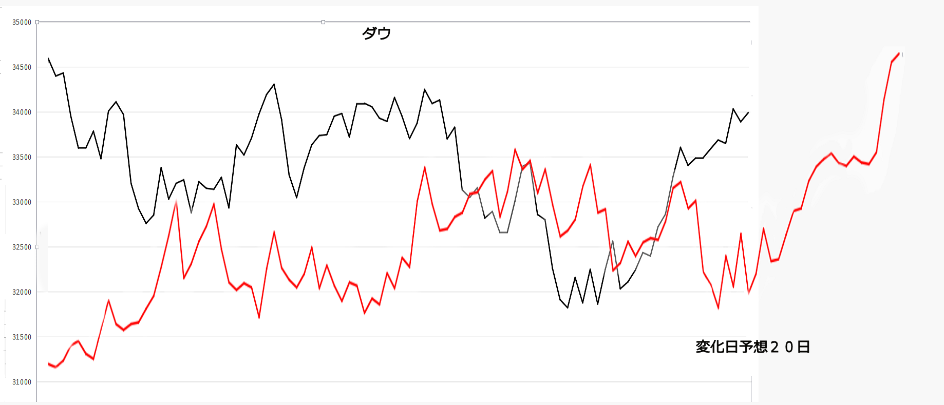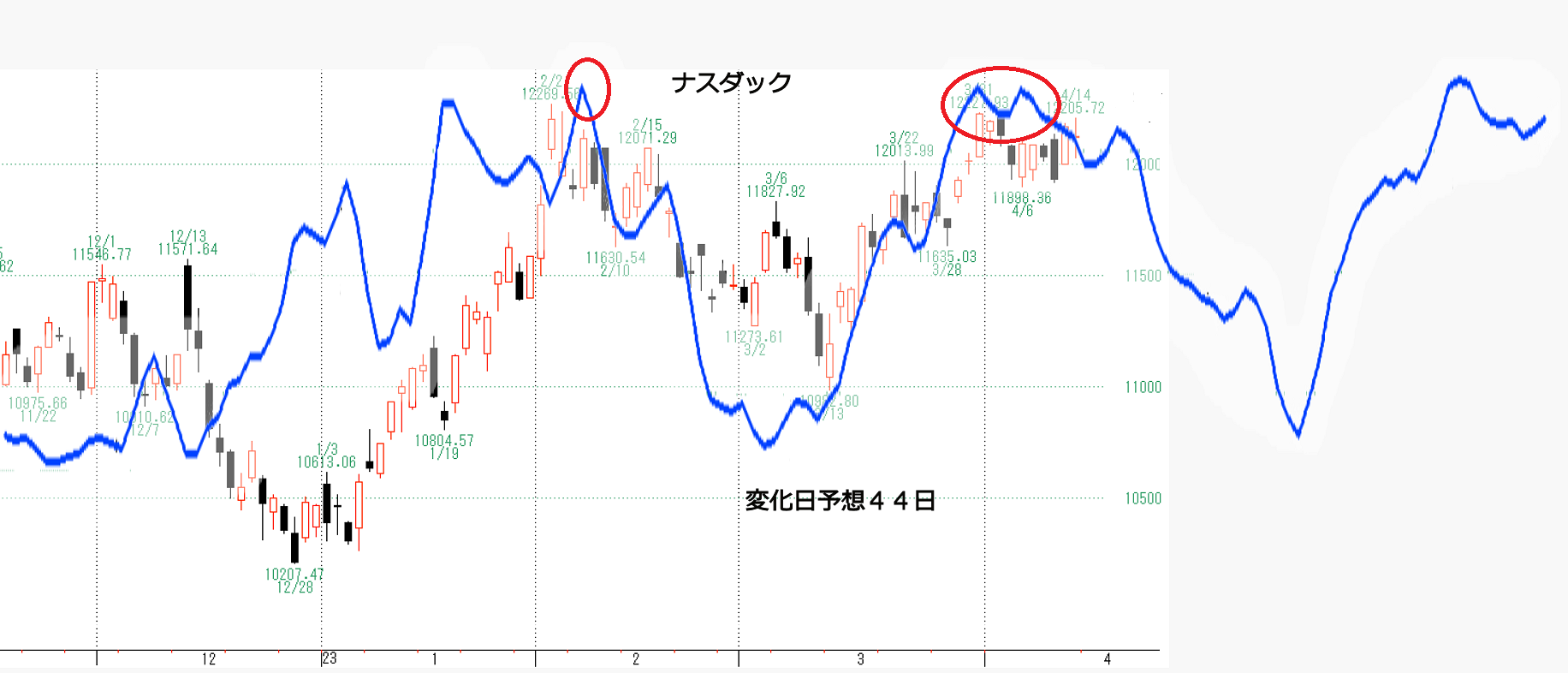次にナスダック指数を新開発の「44日先までの変化日のみ予想」でみてみます。