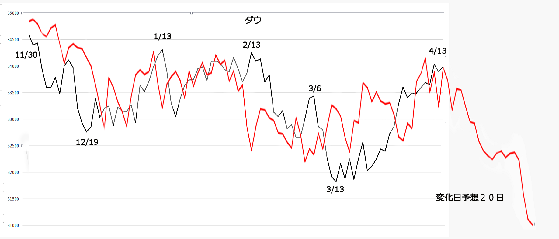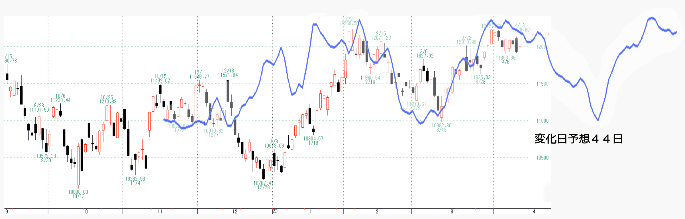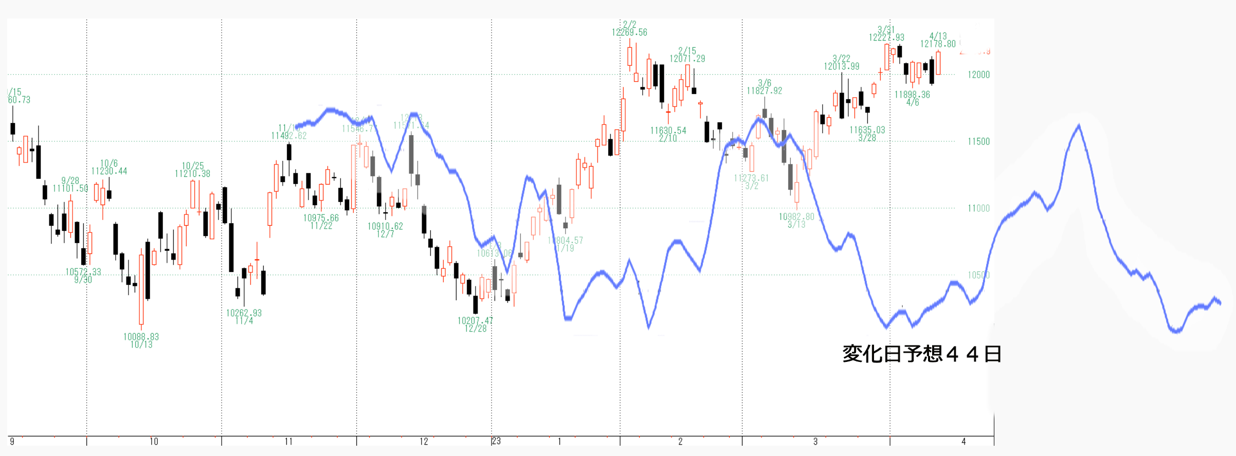 変化日のみはほぼ予想できているかと思います。次の大き目の変化日は4月20日前後の予定です。変化日が高値=売り、変化日が安値=買い です。現状では多分売りになると思います。