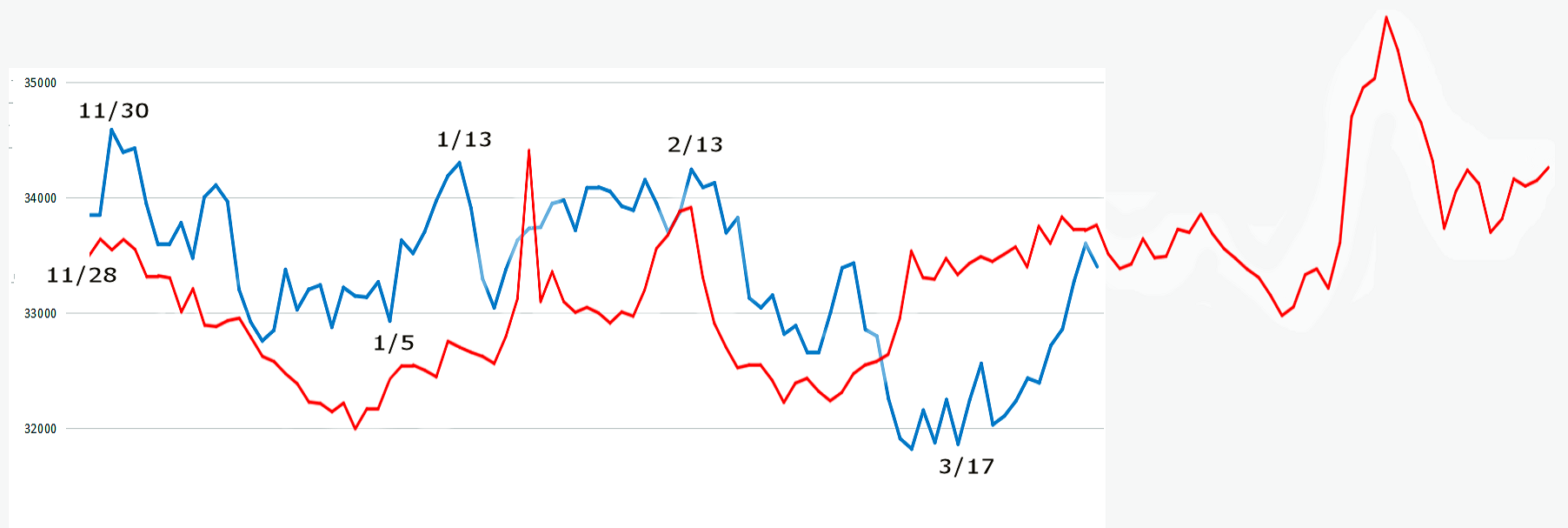 ダウ(黒)と20日先までの変化日予想(赤)です。変化日予想を上下反転します。