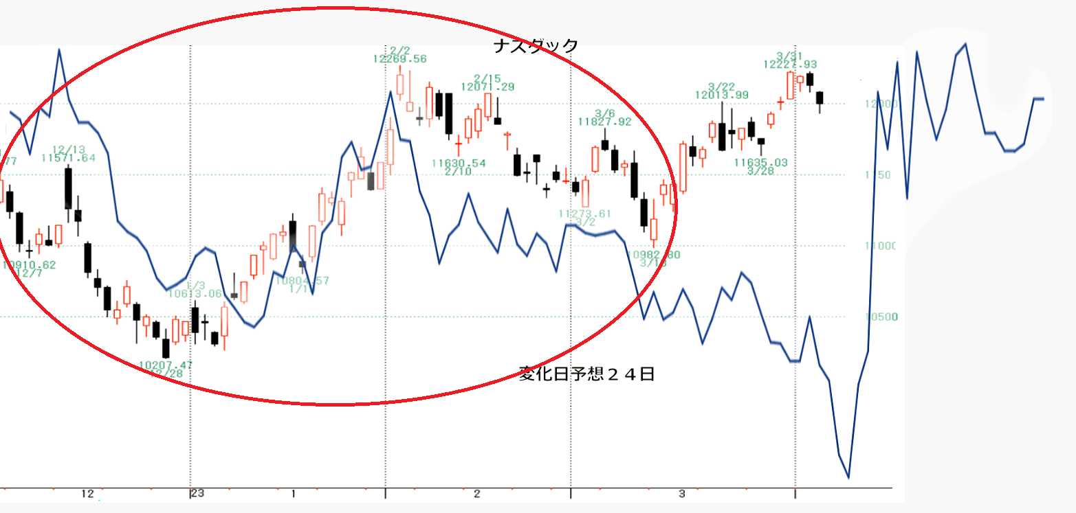 NYの40日先までの変化日のみの予想です。変化日が高値=売り、変化日が安値=買い の傾向です。なお、これまで他の手法でも4月3日(前後1日含む)売りと予想してきており、ナスダックは続落、ダウは昨日下落でほぼ予想通りに動いてきます。