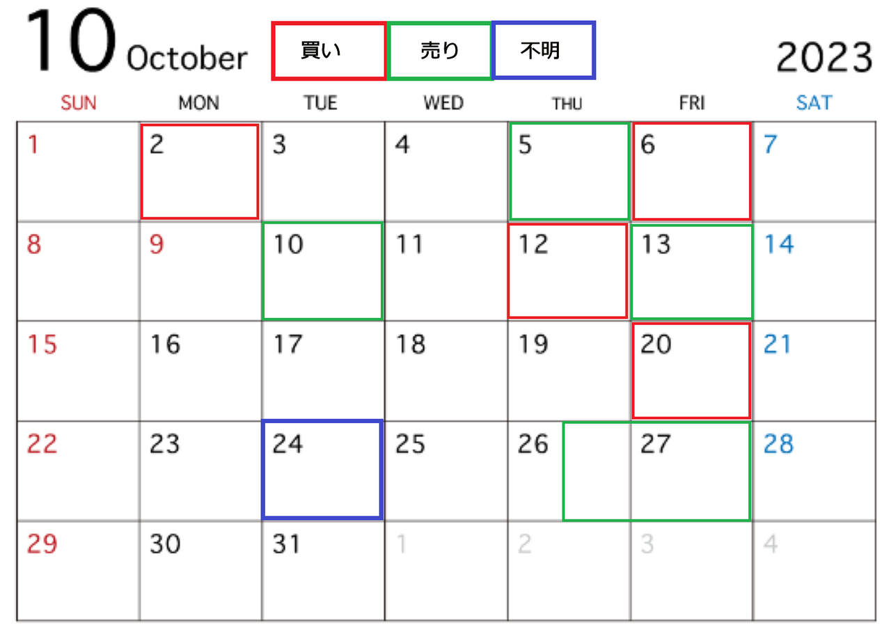 変化日のみは1日のズレはありますが、外さないと思います。しかし、買い・売りは9月同様、予想の難易度が高いため当てになりません。8月以前ように簡単にはいきませんので、10月も自信はありません。