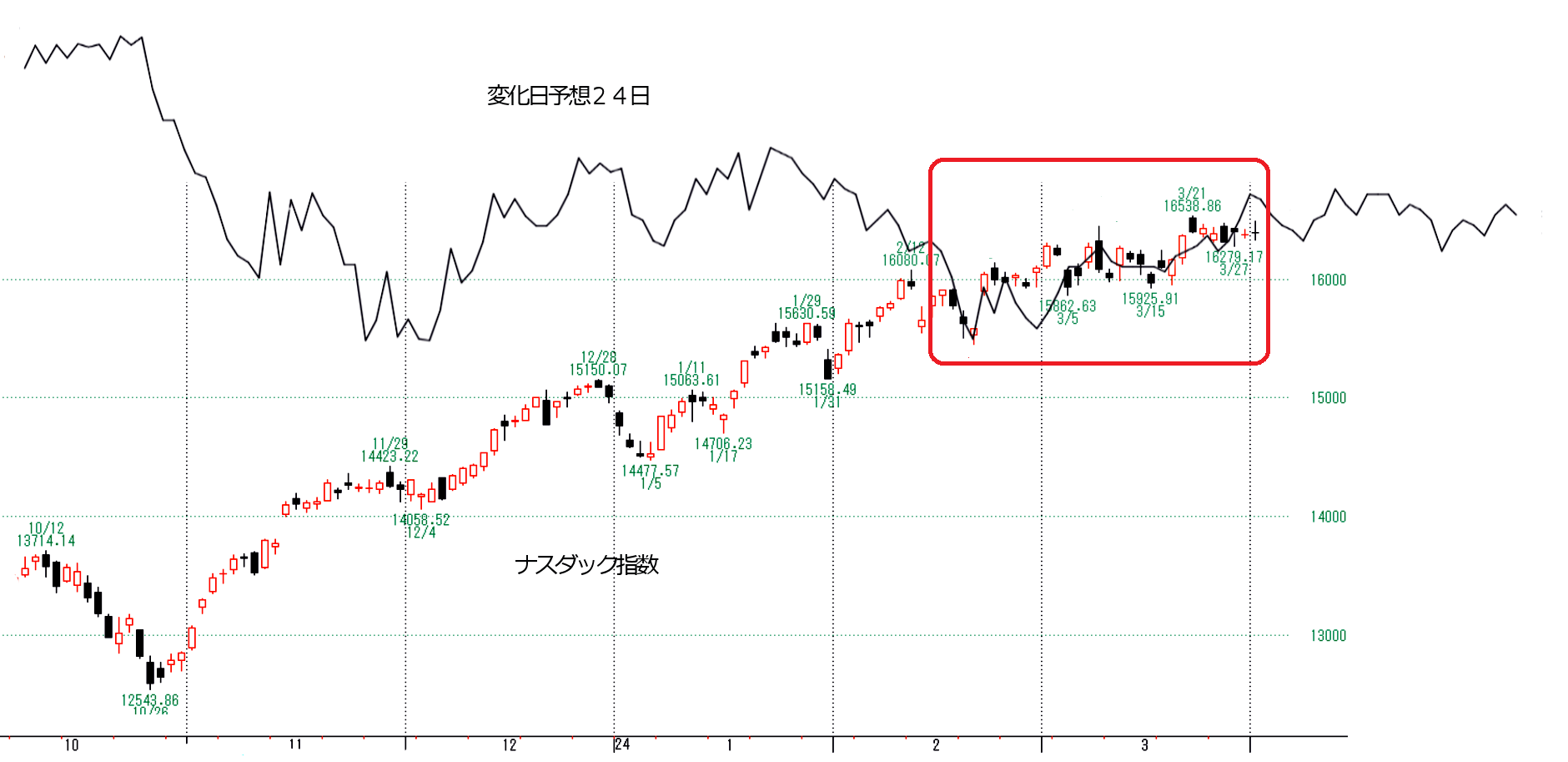 ナスダック指数の24日先までの変化日予想です。これまでの改良版になります。