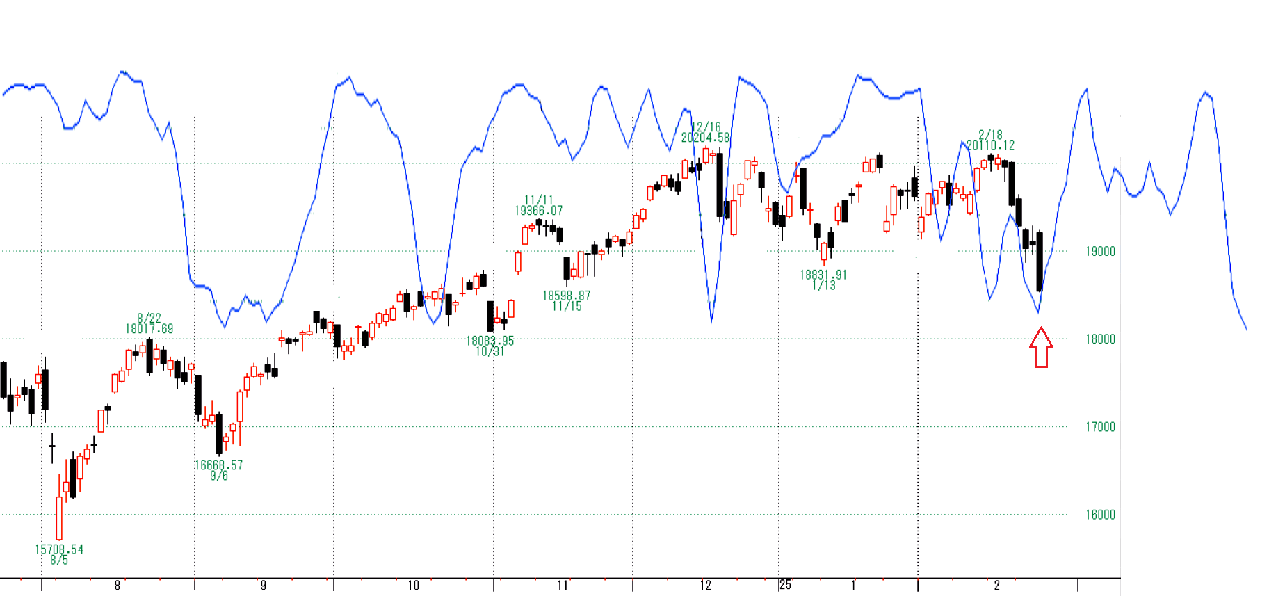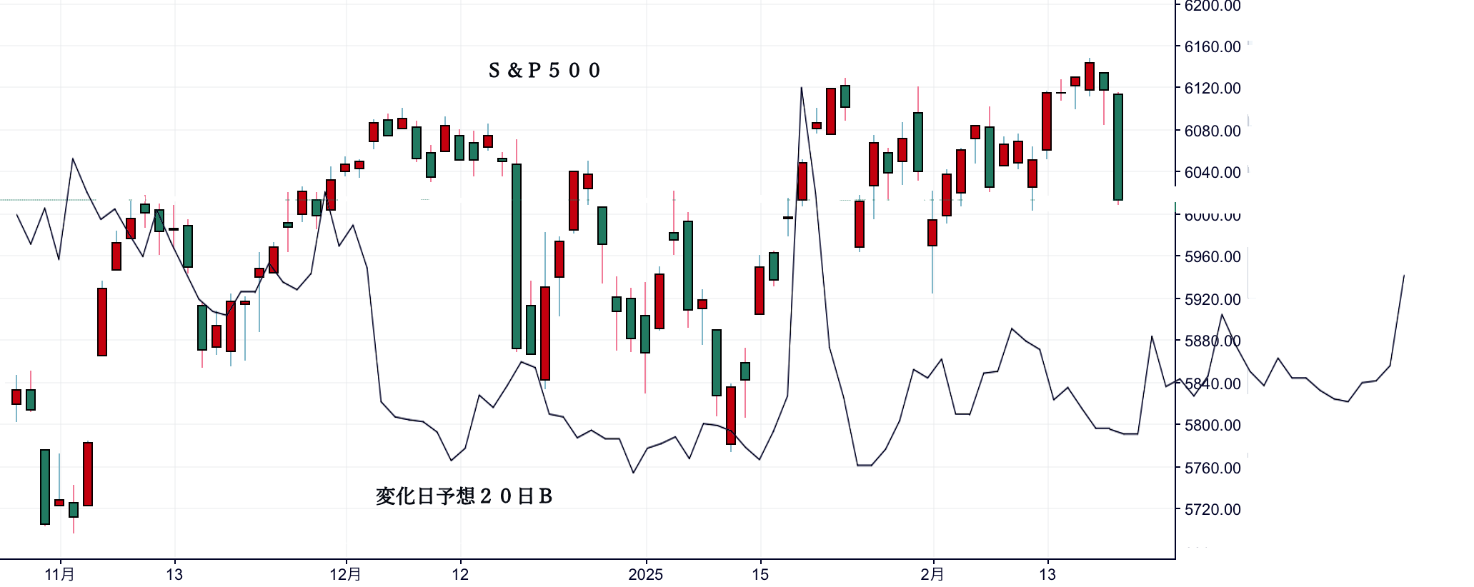 変化日を安値で迎えたため買いと予想します。なお、一目均衡表では変化日は「前後1日含む」と記されています。1日の誤差はご容赦下さい。参考に変化日予想を上下反転します。