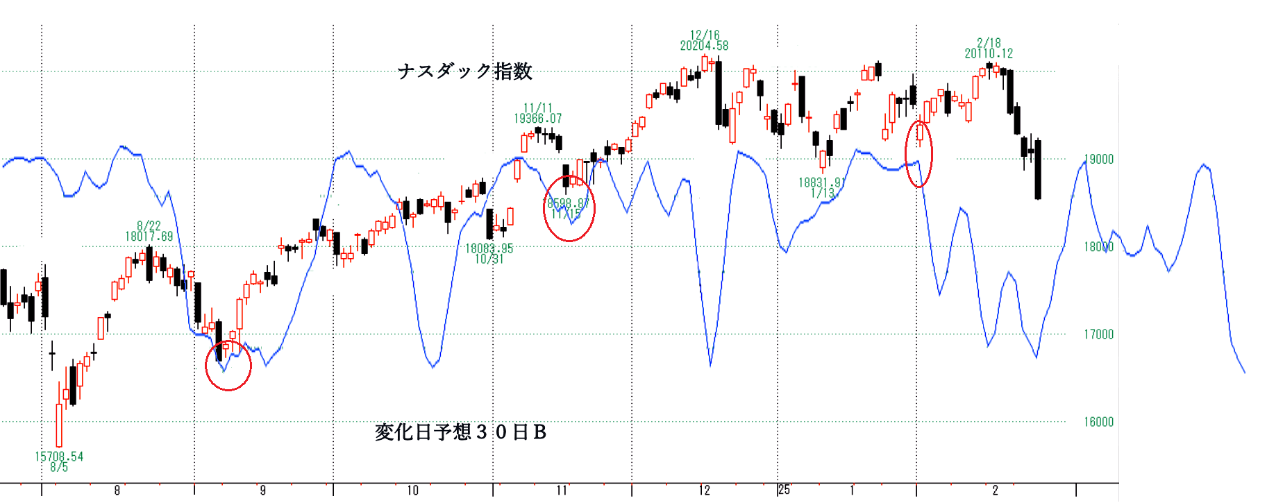 ナスダック指数の30日先までの変化日のみ予想です。変化日が高値=売りまたは買い見送り、変化日が安値=買いまたは売り見送り でご覧ください。この手法は前回2月17日に取り上げました。そして2月18日、2月27日売りと予想しました。結果、NQは2月18日天井、2月27日は高く寄ったものの大幅安。ピッタシでしたので、次は外れる確率が高くなることを頭に入れて下さい。